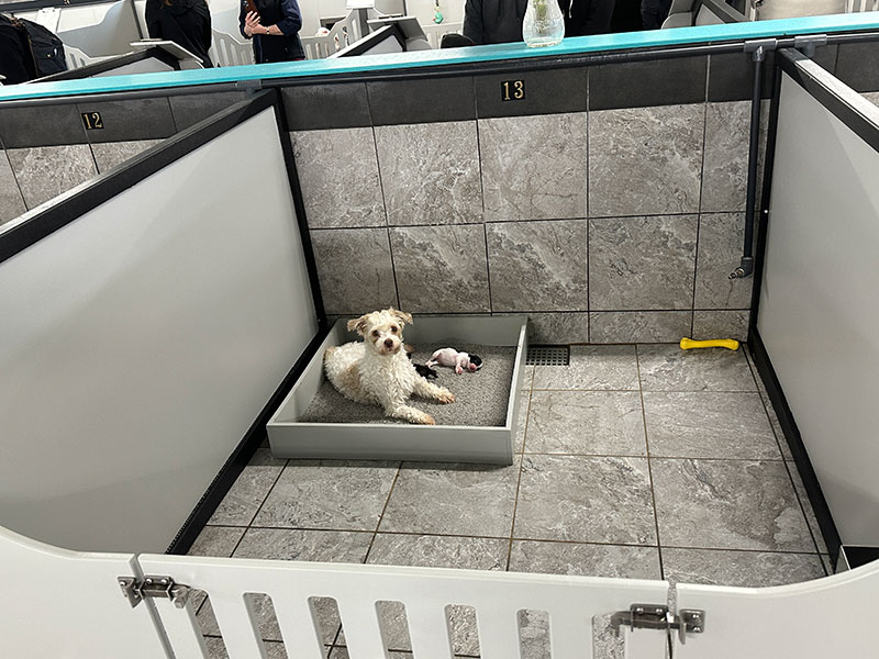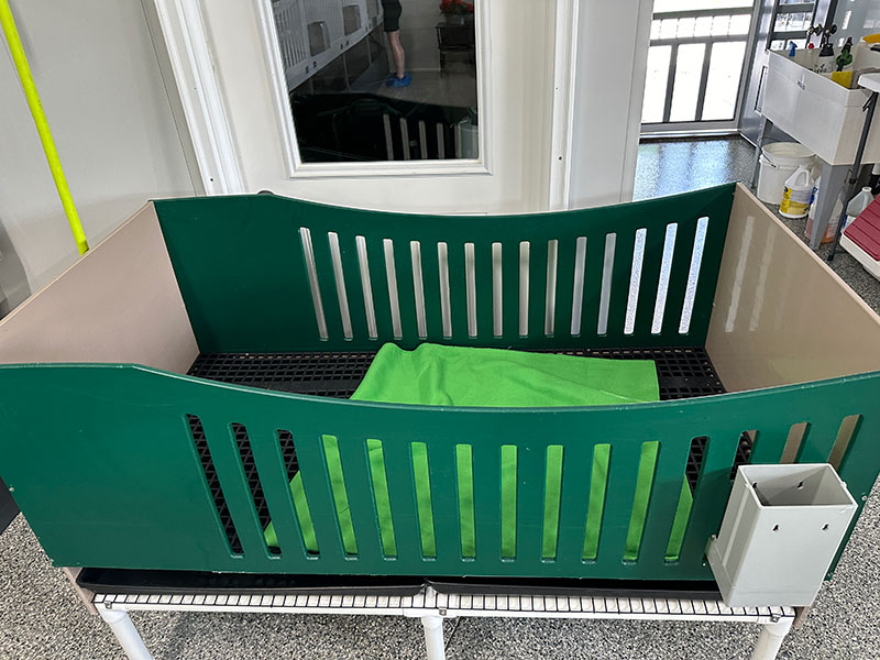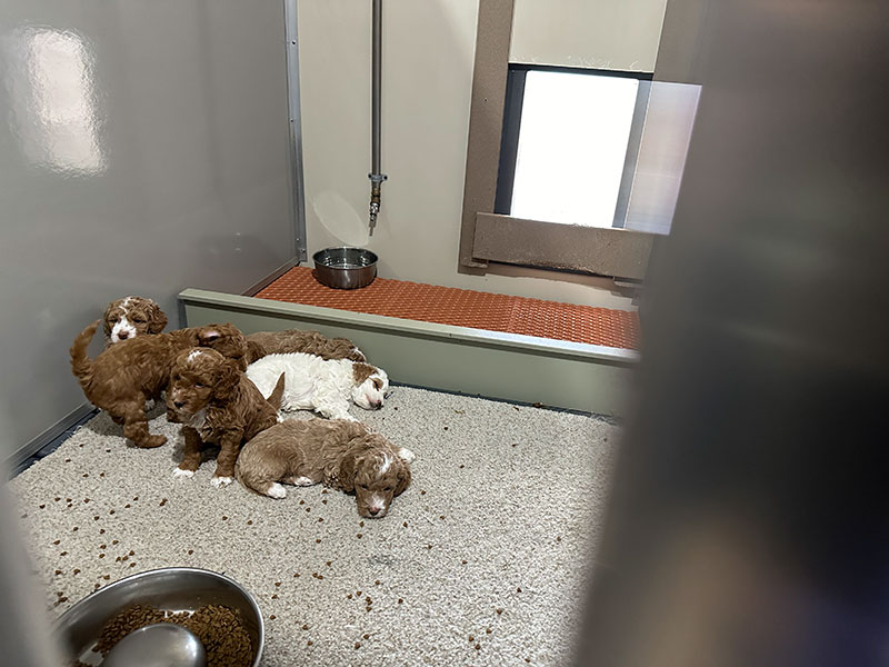 Breeders create separate areas for pregnant moms and also for their puppies. This area is separate from the rest of the kennel to create a quiet zone. The floors have heated areas to help the puppies regulate their temperatures.