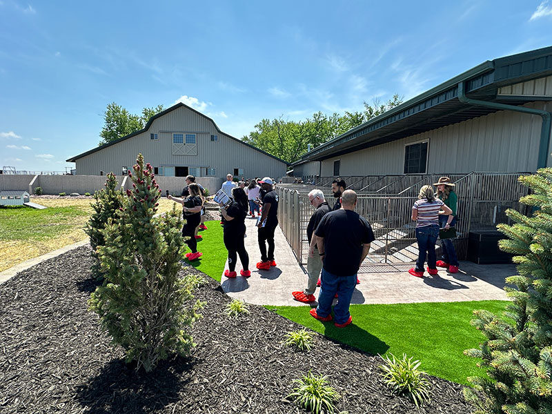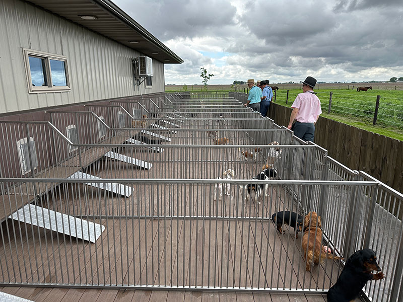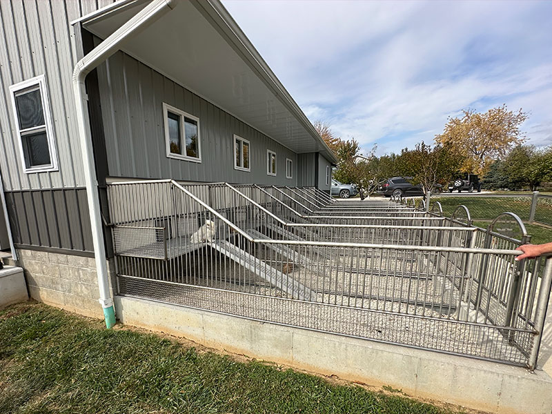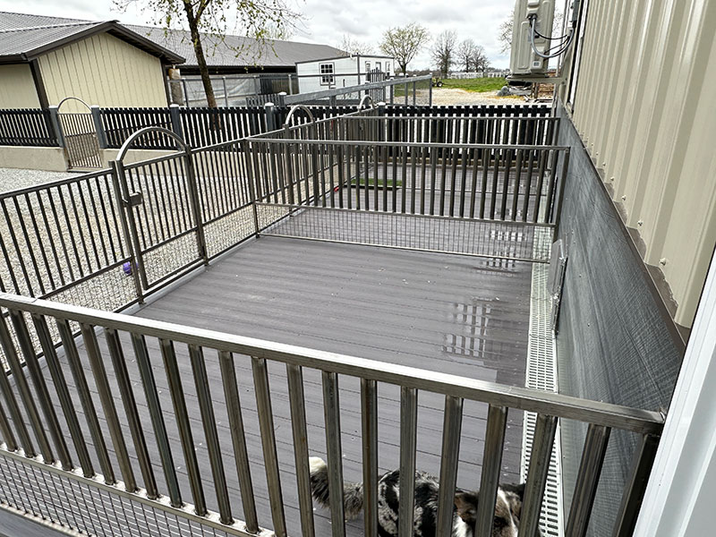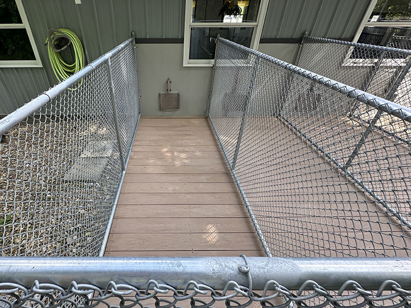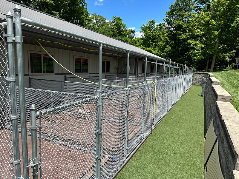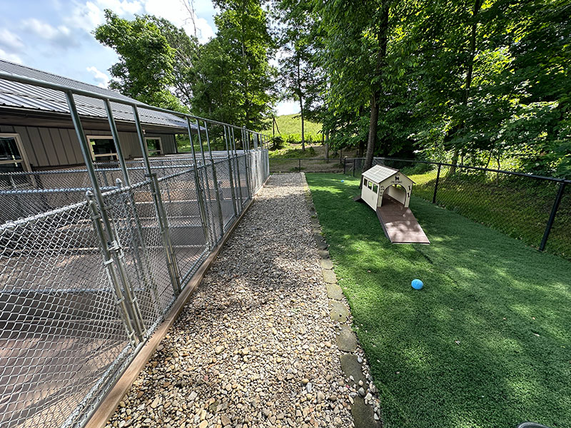 Outside runs allow dogs to stretch their legs and get fresh air. The floor surfaces are different than the inside surfaces for mental stimulation and foot and leg health.
