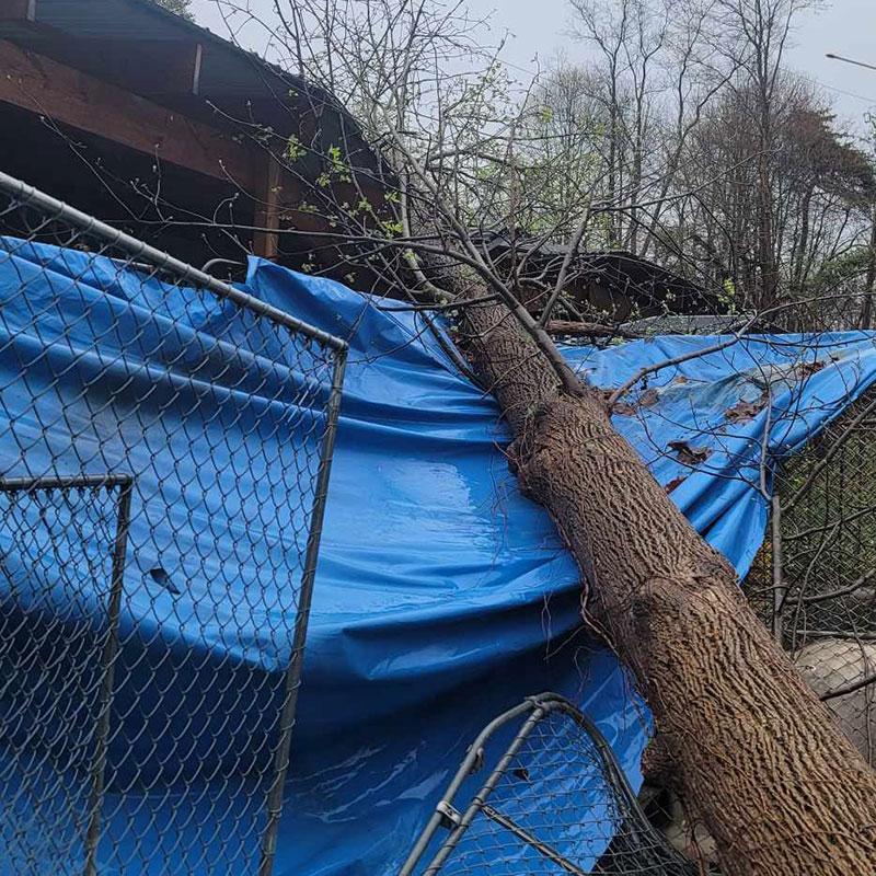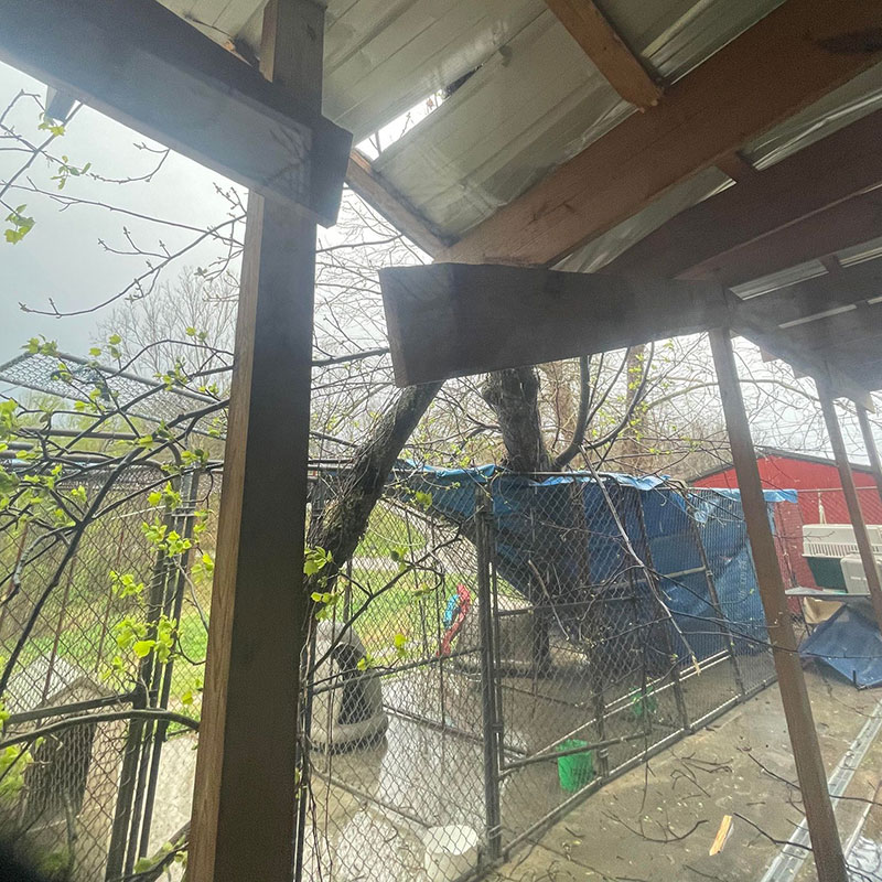 When storms rolled across Indiana, Kentucky, and Ohio, heavy winds toppled trees and left a path of debris for Cabin Critters Rescue, located in Wheelersburg, OH. During the storms, a large tree fell on a brand-new addition to their building, taking out most outside kennels and destroying part of the roof. No animals or humans were harmed, but the damage threw the rescue into a huge predicament as it housed many dogs of varying sizes and ages.
