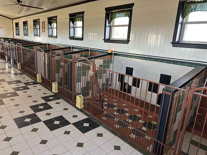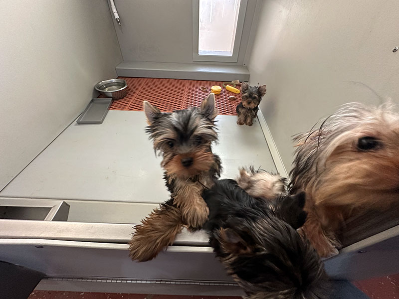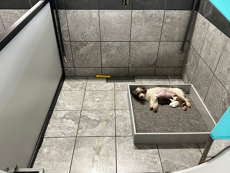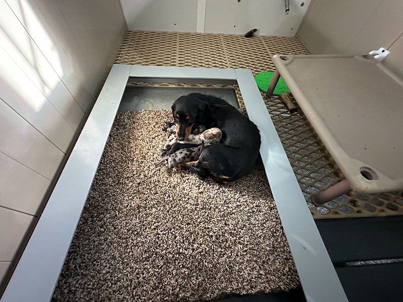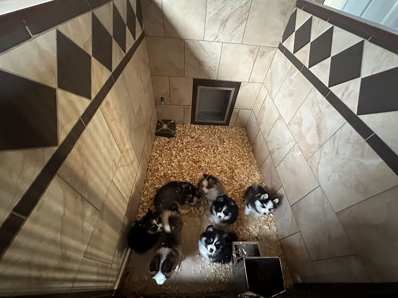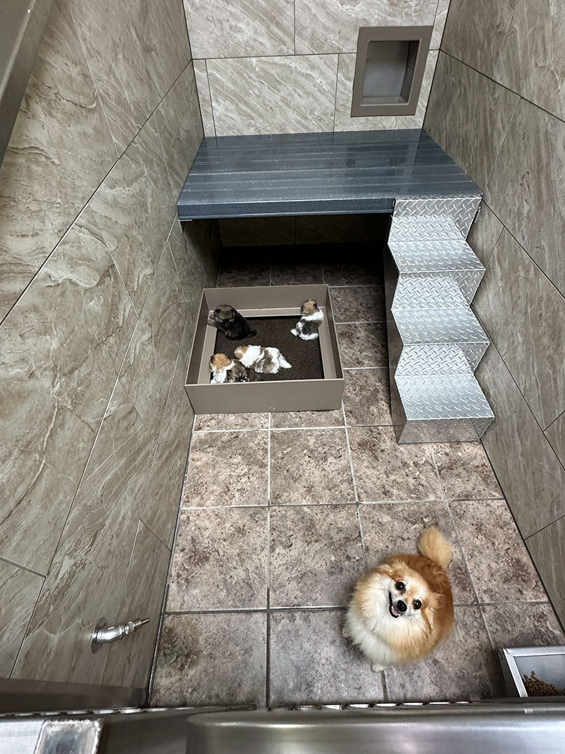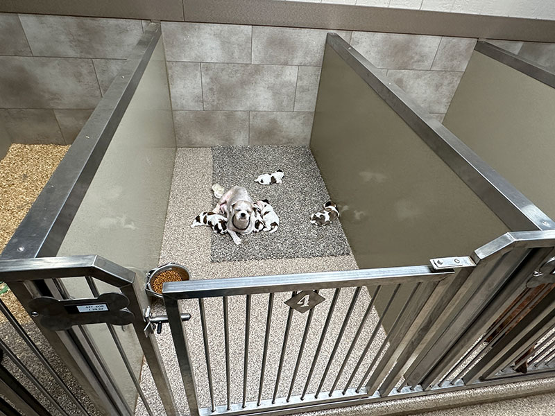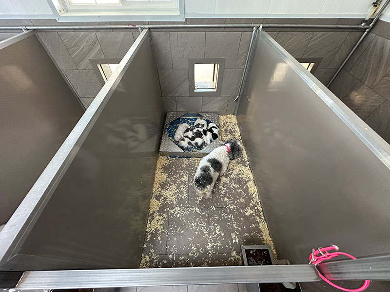 Breeders create separate areas for pregnant moms and also for their puppies. This area is separate from the rest of the kennel to create a quiet zone. The floors have heated areas to help the puppies regulate their temperatures.