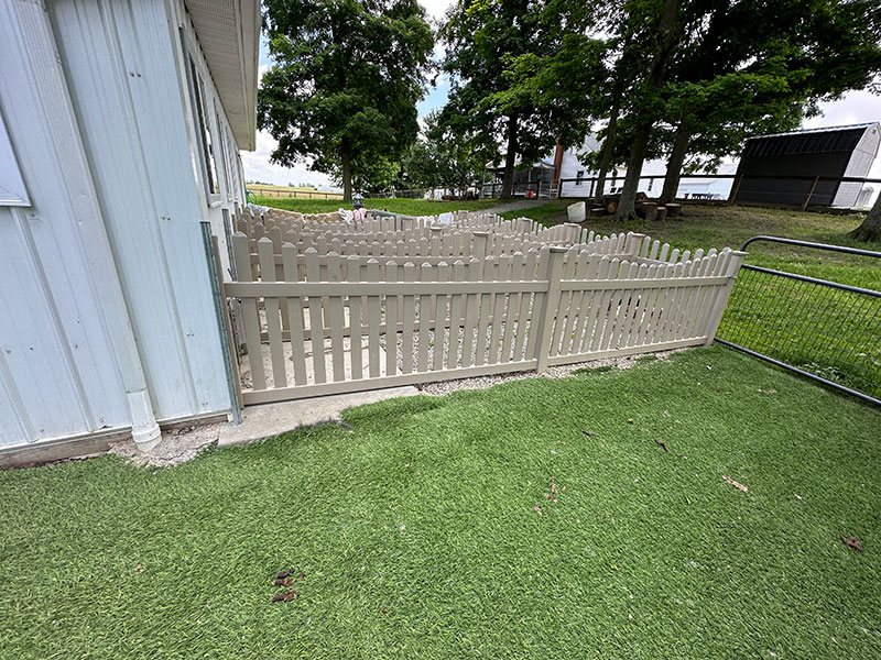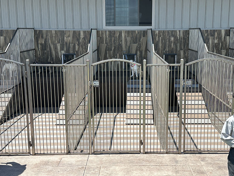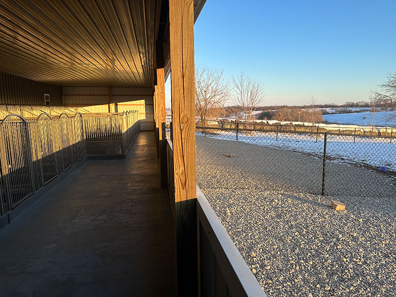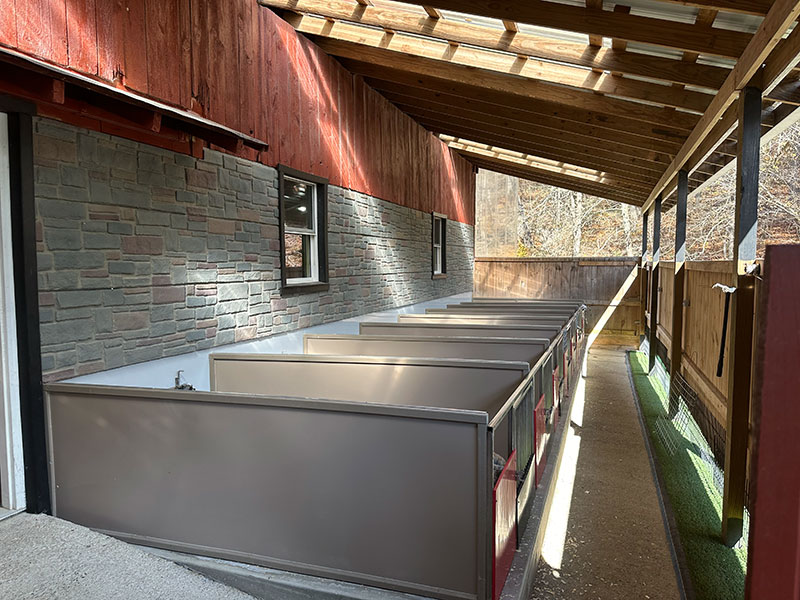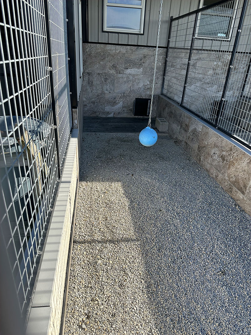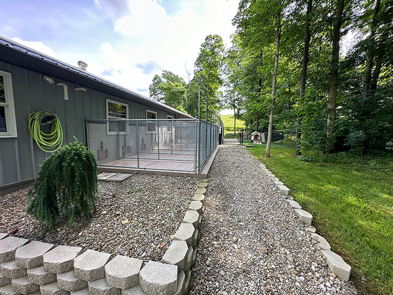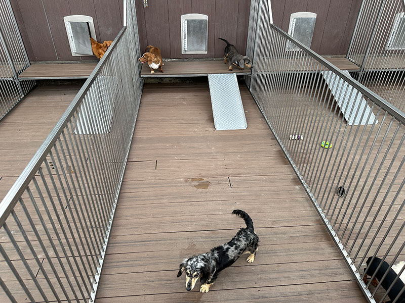 Outside runs allow dogs to stretch their legs and get fresh air. The floor surfaces are different than the inside surfaces for mental stimulation and foot and leg health.